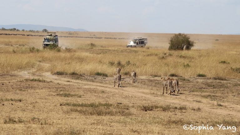 獵豹因為沒有很好的夜視能力,屬於日行性動物,是草原上起步加速最快的動物,雖然常後繼無力,但牠無論什麼姿態都超級優雅。因為是日行動物,遊客很容易見到獵豹,牠們也很習慣靠近吉普車。有一次5隻的獵豹就幾乎碰到了我們車子的後保險桿,我們一方面很興奮,可以如此貼近看到獵豹,另方面也深怕獵豹跳上車,緊張地大氣都不敢喘一下。後來才聽說,這群豹家族很頑皮,不但喜歡靠近吉普車,還常跳上車,把遊客嚇壞了。當下,遊客可能是嚇出一身冷汗,但後來卻又炫耀PO文,從網路不少這類炫耀文,就知道這獵豹家族有多皮。
